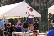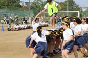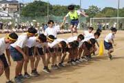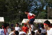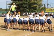 今年初めて行われた団種目「背渡りリレー」です。身軽な選手が背中の上を渡っていきます。女子は赤団が1位となりました。