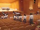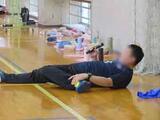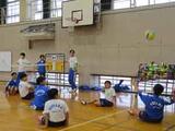 シッティングバレーボールは障がい者スポーツの1つで、講師の方は北京パラリンピックで8位、東京パラリンピックで8位になった日本代表の選手です。バドミントンコート4面を使い、女子ネット1m5cm、男子年と1m15cmの高さで戦います。