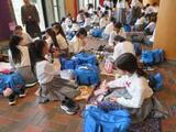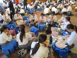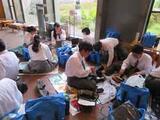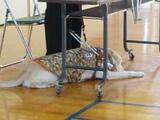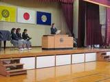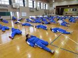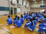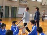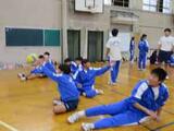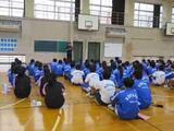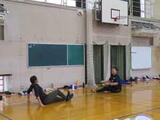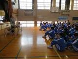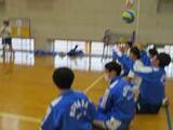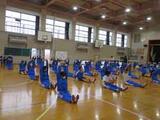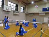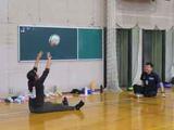 ポールやネットは講師の方がご用意くださり、5時間目は講演とお尻を床に付けて動く練習(フットワーク、オーバーパス、アンダーパスなど)に取組みました。6時間目はサーブ練習ののち、各クラス男女がそれぞれ2チームに分かれ、ローテーションで試合を行いました。