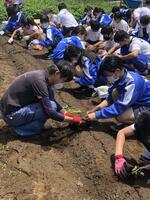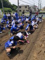 本日4時間目、本校学校ファーム「こやばたけ」で、1年生全員によるサツマイモの苗植えを行いました。本校教育後援会、学校応援団の方にご協力いただきながら、一人一本ずつ苗を植えました。教育後援会、学校応援団の皆様、ありがとうございました。