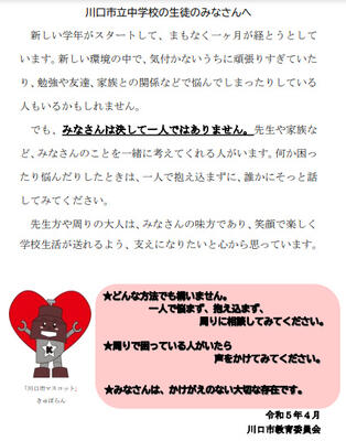 川口市教育委員会からメッセージが届きました。ぜひお読みください。
