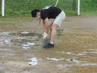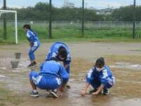 前日夜遅くまで雨が降っていたので、グラウンドは水たまりでいっぱいでした。ただ天気予報では8日は曇りのち晴れであること、予備日の11日(火)は晴れの予報でしたが、前日が祝日の上、雨の予報であることを踏まえ、予定通りの実施となりました。