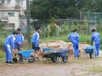 そのため職員は朝早くから集まり、グラウンドの水取りから始めました。また、係の仕事のある生徒たちが登校し始めると、一緒になって水取りや砂まきを行い、グラウンド整備に慣れているサッカー部がトンボをかけ、なんとか競技ができるようにグラウンドを整えました。
